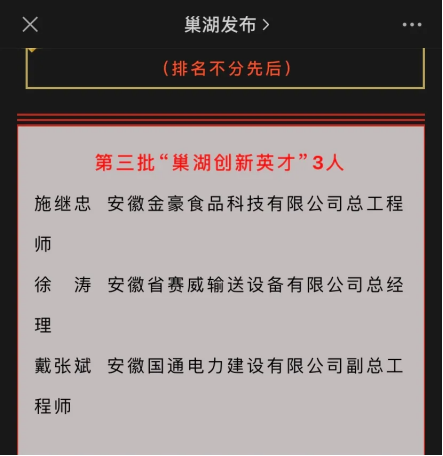 喜讯!国通电力副总工程师戴张斌入选巢湖创新英才(2021年5月21日)