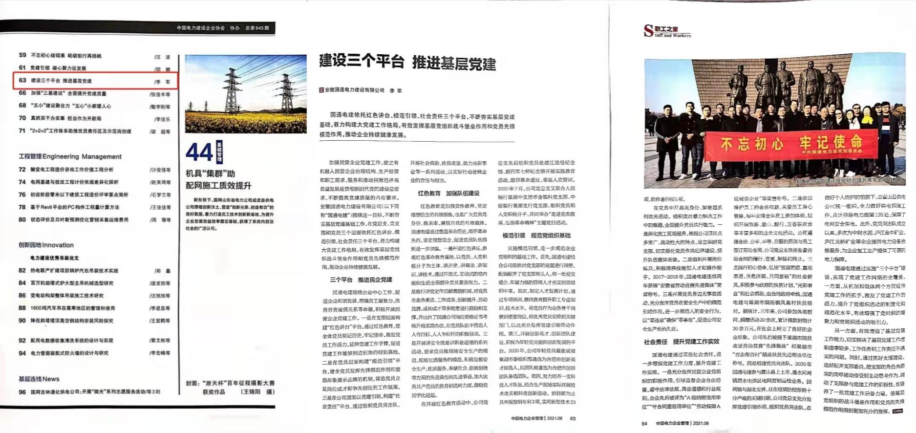 为了庆祝中国共产党成立100周年,充分展示电力企业优秀党建成果,由安徽省电力协会今年举办的《汇聚党建力量》征文活动,得到了安徽国通电力建设有限公司积极响应。国通电力党总支投稿的《构建“三个平台”,筑牢党建基础》一文获得三等奖!